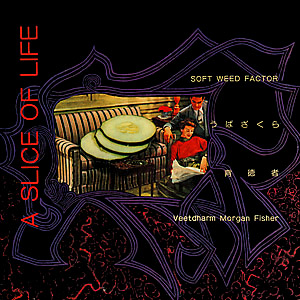 | A SLICE OF LIFE (1985) 3 tracks on a Japanese compilation album Japan: LLE Records LLE-1009 1. The Emerald Isle 2. In A Gentle Way 3. Going Nowhere Satoru Takazawa: Percussion Other Bands: Soft Weed Factor, Ubazakura, Haitokusha A refined and musically-inclined doctor, Satoru Takazawa (whose stage name is Pneuma and whose band is called Trembling Strain) invited Morgan to record a few pieces for an album which also featured three fine Japanese underground bands. Two of the tracks were recorded in Pneuma’s home studio using cheap synthesisers and percussion. The third is a live track featuring Morgan playing piano and melodica through his extended tape delay setup. A charming glimpse of the early days of Morgan’s musical rebirth in Japan. The cover was based on a design by Morgan in the style of the "Cards To Keep" series of collage postcards he created during his Pipe Records era (see the Art Gallery). |