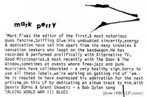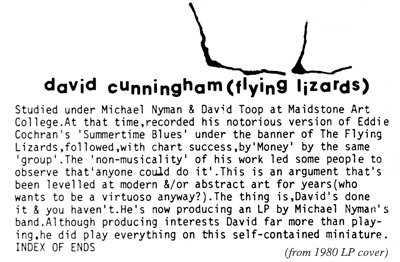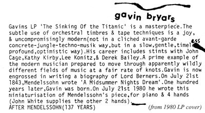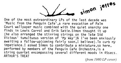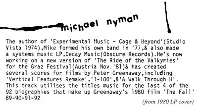 I’m getting near the end of this blog, so I’d like to mention what a pleasure it is to have the time and space to expand on the miniature sleeve notes I was able to provide on the original album cover. An LP cover is 12” square, so that’s 12 x 12 = 144 square inches. Divided by 51 tracks, that equals a hair over 2.8 square inches per track. Not a lot of space in which to include track title, artist name, and a descriptive blurb. So, if I may, and for the first time, in the spirit of Michael Nyman’s systems music I’ll systematically go through Michael’s 1980 mini-blurb and build on each line. As Michael once said: “I’m not a great inventor from scratch. What I do is to use, steal, acquire, reproduce or re-cycle music from other musicians.” Here goes…