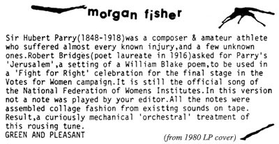 I neglected to mention in the original sleeve notes that the lyrics of “Jerusalem” were taken from the opening lines of the poem “Milton” by the great English poet, artist and mystic William Blake (click on his name to see an extensive and impressive archive of his life and work). Blake was a gifted child and studied art formally from the age of ten. Unfortunately it may be true that his art killed him, due to the fumes he was continually inhaling while exposing copper to acid during the unusual engraving process he favoured. His very last book, completed on his deathbed, was a version of “Jerusalem” (not the song; this was his greatest epic work on the fall of Albion – no two copies are the same as he would alter the text and colours between each printing). It sold for a mere 5 guineas (a quarter of its regular price), but enough to cover the cost of his funeral.
