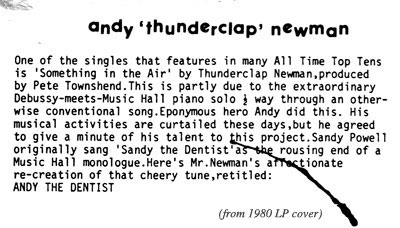 Now of course the good news is that Andy “Thunderclap” Newman is back in action again, treading the boards with a new version of his eponymous band and tickling the ivories after a long break from The Biz. I found out about this via a Facebook connection to his current manager and veteran rock shaker-and-mover, Ian Grant. And for those few who do not know who Thunderclap Newman – the man or the band – are – here is a completely conventional link to a video of their magnificent world-shattering 1969 #1 hit “Something In The Air.” And another link to a surreal promo film they made at the time. And their Wikipedia entry, very detailed and interesting.