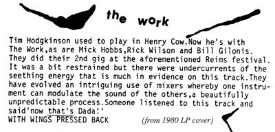 The Work, like the name suggests, had a tough, non-nonsense, committed approach to music, spiced with ear-bending timbres and the occasional glimpse of British humour if you looked carefully. I reckon they fall into the same loose bag and era as PIL, The Fall, This Heat, Gang of Four, and so on. As you can see, an abundance of four-letter words. No frills, sometimes an almost dour militaristic beat, yet out there on the bleeding edge in terms of sounds and structures.