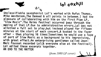 When Cherry Red Records, following the release of my first Hybrid Kids album, suggested I make my own sub-label under their friendly umbrella, I plumped for starting Pipe Records (and ending, as it happened) with two diametrically opposed recording projects: Miniatures, with its galaxy of 51 musical adventurers, and what was to eventually be called Slow Music, an ambient album based largely on tape loops of Lol’s playing. I felt inspired to do this after hearing “Digswell Duets,” an album Lol had made a couple of years earlier, on which he played, echoed and looped over soundscapes created by electroacoustician Simon Emmerson. In true Lol style, the eclectic album also includes versions of jazz standards accompanied by Veryan Weston (pianist of Miniatures band Stinky Winkles).