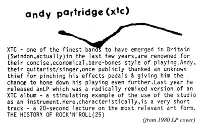 “Come to the Townhouse” came the reply, not long after. XTC were at this brand new, state-of-the-art studio in West London, working on their new album. Andy studied me through his owlish spectacles as I listened to the track for the first time and reacted with the words, “now that really is a miniature!” – for he had made almost the shortest track (a hair under 20 seconds – only beaten by Joseph Racaille’s 14-second epic). Pithy was still the rule, it seemed, and Andy had reviewed the first 40 years of Rock’n’Roll, taken the pith out of it (pun intended) and presented it as this little bonsai of a lecture.
