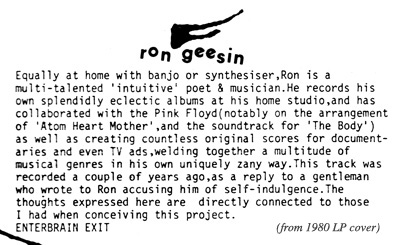 As the opening track of side 2 of the original Miniatures LP, Ron’s “Enterbrain Exit” was magnificent, perfect. People ask me if it was a hellish task trying to sort out the running order of 51 tracks. Well, it took about 3 hours and 51 little bits of paper with titles on them, moved around on my bedsit carpet. The task was made a lot easier by tracks like Ron’s that fairly leapt off the carpet at me saying “I need to go HERE!” Ron’s music and words summed up what this whole mad album was about. Here’s what Ron recites in his musical diptych: