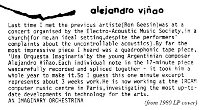 Like several other artists on Miniatures, this was Alejandro’s first publicly released work, in spite of the fact that he had already reached a very high level in composition and sound design. Since then, his biography indicates his ongoing progression to higher and higher levels, with various awards such as a Guggenheim Fellowship and numerous composition prizes. With his technical prowess I can imagine that he took to the IRCAM electronic music studio like a duck to water. Quite different to the less-electronic-minded John Cage, who felt intimidated by the amount of equipment in the studio, and dealt with his anxiety by simply taking a sheet of paper and a pencil, and drawing a picture of it. This forbidding high-tech installation then became a toy, something to play with. I tried this drawing approach myself once after installing my first home studio in Tokyo – it really works.