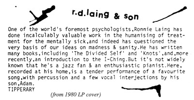 Once he got into the swing of it, and had settled on the World War I classic “It’s a Long Way to Tipperary” as the tune he would play, his son Adam, 12 years old at the time, came and sat next to his dad, playing a small bongo such as one would buy at a souvenir shop on the continent, and singing the odd phrase from the song in a light, shy voice. I sensed a camaraderie between father and son that touched me, particularly as I hadn’t had a dad since my parents divorced in 1966. Whether I was mistaken or not, (judging by later reports of the Laing family life, and a marital separation little over a year after my visit), it felt like a good day in the Laing household. His warm and welcoming wife Jutta had already made a nice cuppa tea for me, which certainly eased my slight tension at being in the house of such a legendary figure (one who I had no doubt could see right through my confident façade into the heart of my deepest neuroses, gulp!).