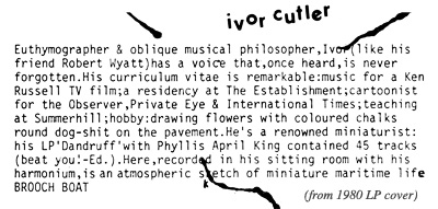 “The King’s Penny” was how he rather irritatedly described the £1 cash advance royalty I sent to each Miniatures artist when putting this album together. Most indies labels when they offer a £1 advance as the legal minimum required for a contract don’t actually pay it. I did. Actually. Ivor was the only one who returned it, in a bit of a huff. But as soon as I explained that I was in fact a one-man operation and basically skint, he was all friendliness and compliance.