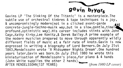 At the Miniatures launch party in 1980, Gavin (along with John White and Dave Smith) performed as the Nordic Reverie Trio behind some potted palms while permed ladies served tea and cake. In this modest way do such musical legends carry out their lives in the service of true beauty. I thank him, from the bottom of my heart, once again.
